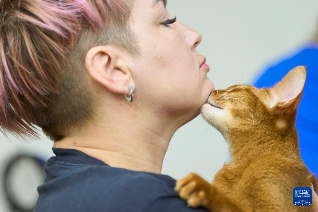 9月21日,一只阿比西尼亚猫亲吻它的主人。