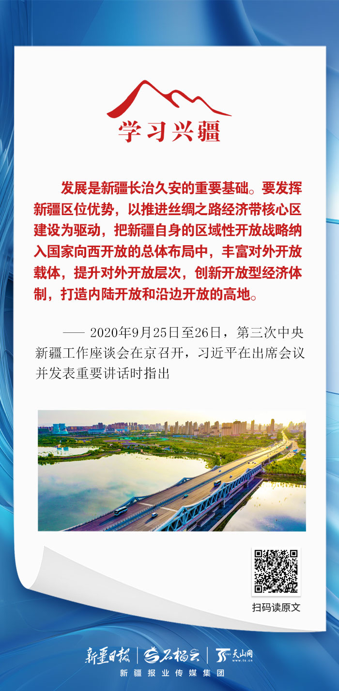 发展是新疆长治久安的重要基础。要发挥新疆区位优势,以推进丝绸之路经济带核心区建设为驱动,把新疆自身的区域性开放战略纳入国家向西开放的总体布局中,丰富对外开放载体,提升对外开放层次,创新开放型经济体制,打造内陆开放和沿边开放的高地。