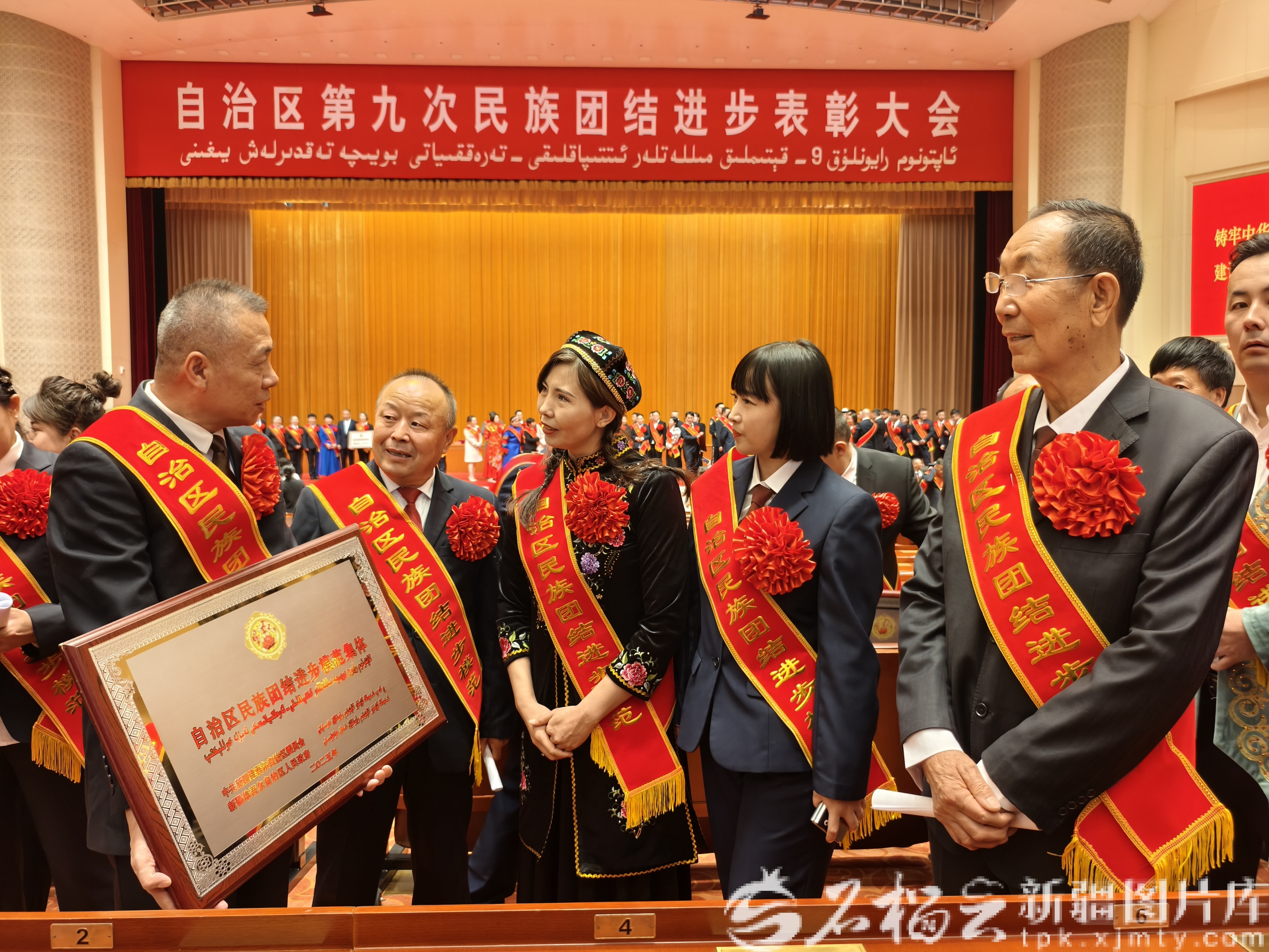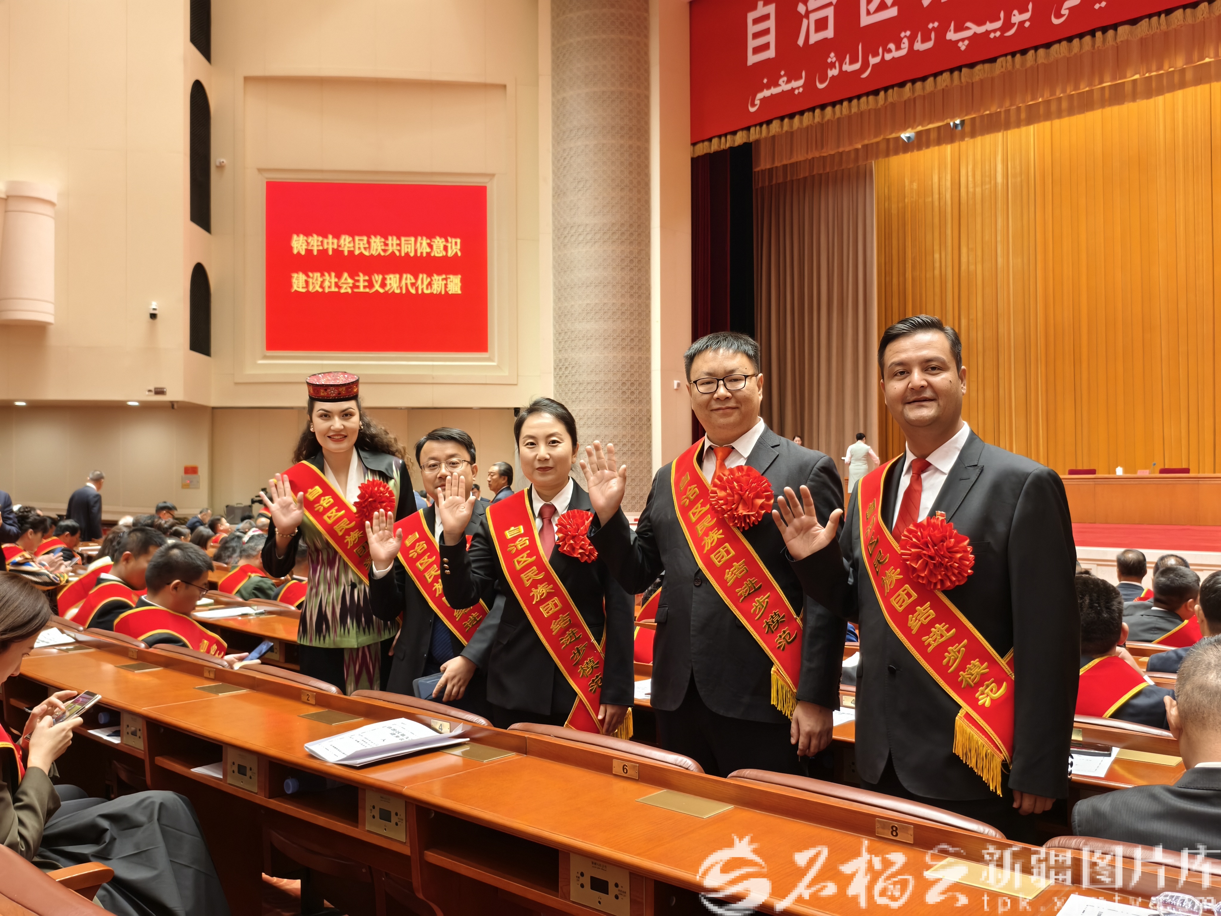自治区第九次民族团结进步表彰大会现场,受表彰模范合影。天山网-新疆日报记者 李嘉妮摄