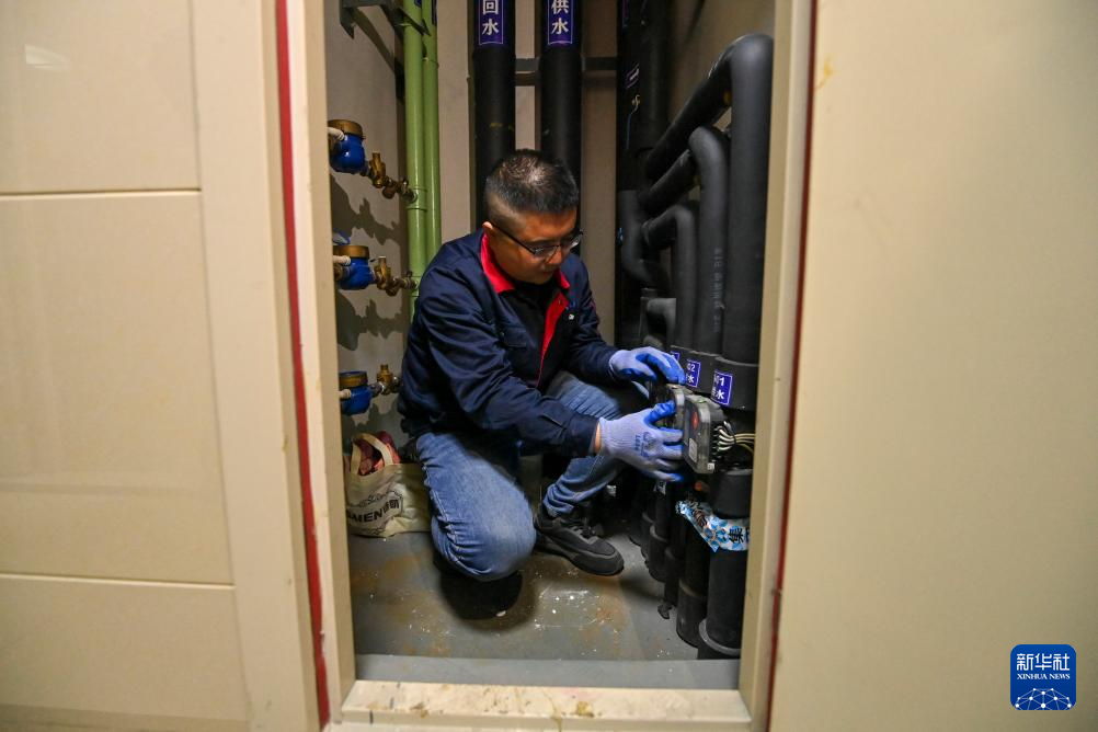 10月20日,在太原市万柏林区一小区,工作人员在楼道供热管井间内检查分户流量情况。
