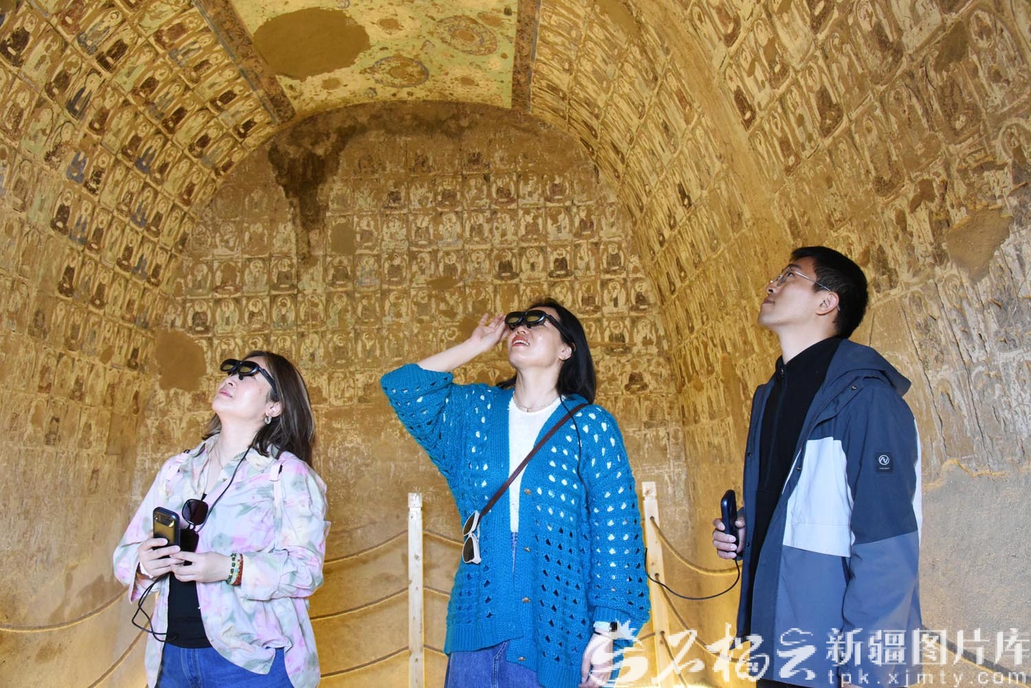 游客通过AR数字技术观赏吐鲁番雅尔湖石窟内精美的壁画(资料图)。 刘健 摄