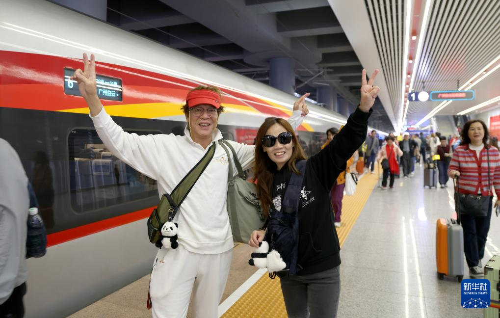 12月22日,搭乘从广州白云站开往湛江北站首发列车的旅客在广州白云站留影。新华社记者 卢汉欣 摄