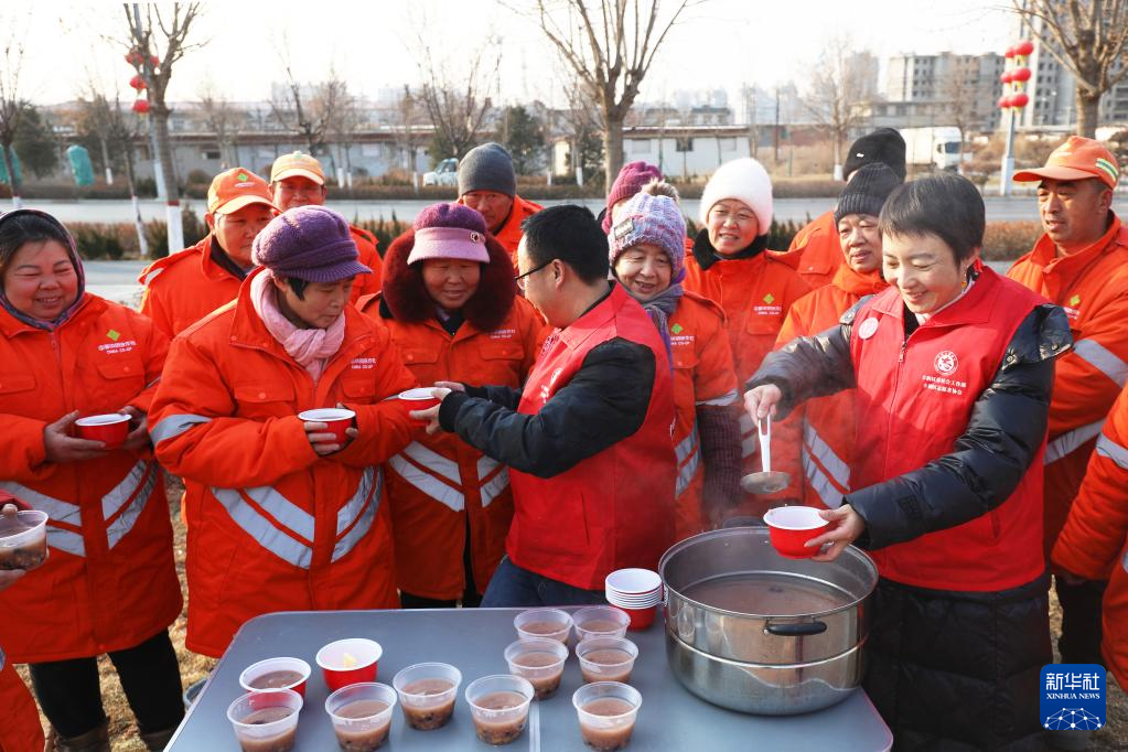 1月24日,在河北省唐山市丰润区街头,志愿者为环卫工人送上腊八粥。新华社发(朱大勇 摄)