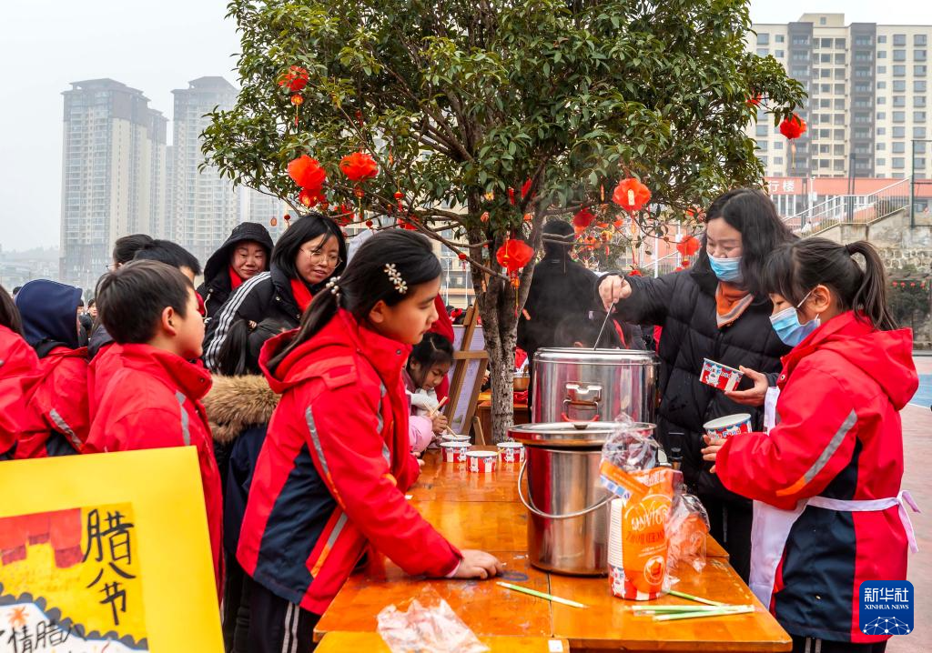 1月23日,学生和家长在贵州省黔西市惠风学校“迎腊八品民俗”文化节活动中品尝腊八粥。新华社发(范晖 摄)