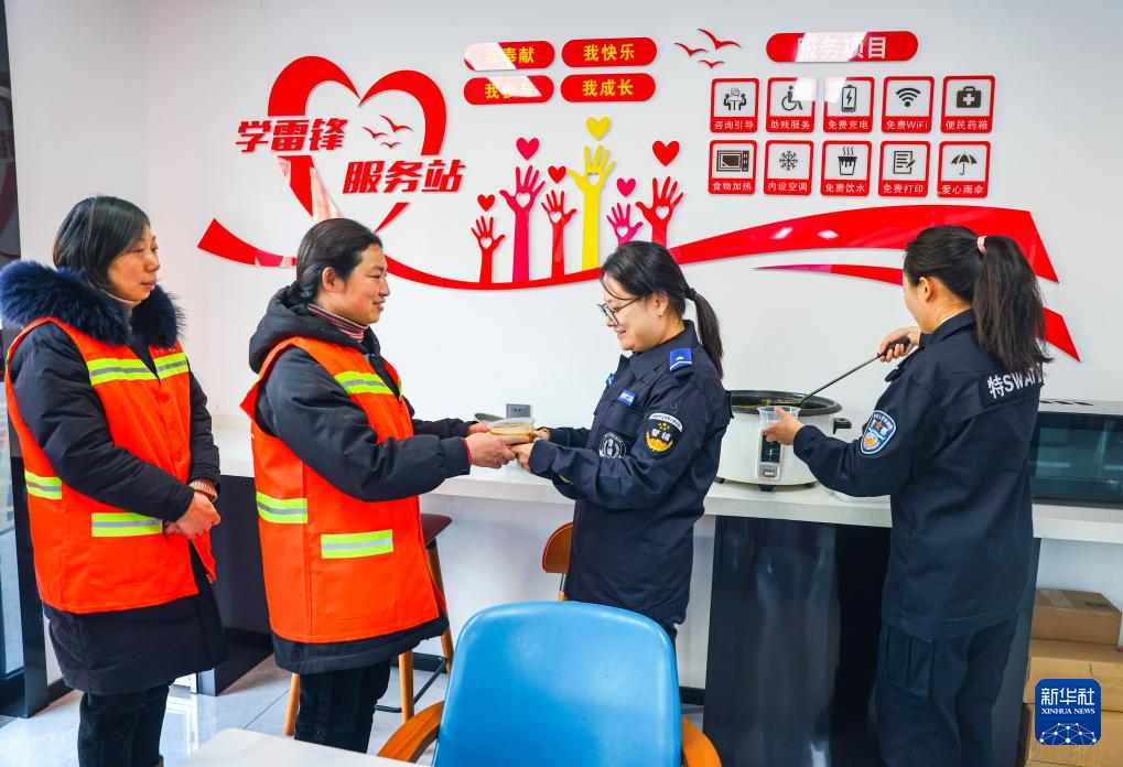 1月24日,在江苏省扬州市公安局江都分局仙城警务工作站爱心驿站,驿站志愿者为环卫工人分发腊八粥。新华社发(任飞 摄)