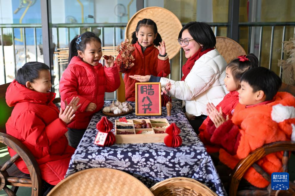 1月23日,在江苏省扬州市九龙幼儿园,老师在教小朋友认识制作腊八粥的食材。新华社发(孟德龙 摄)
