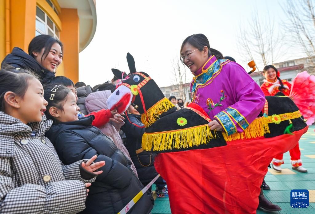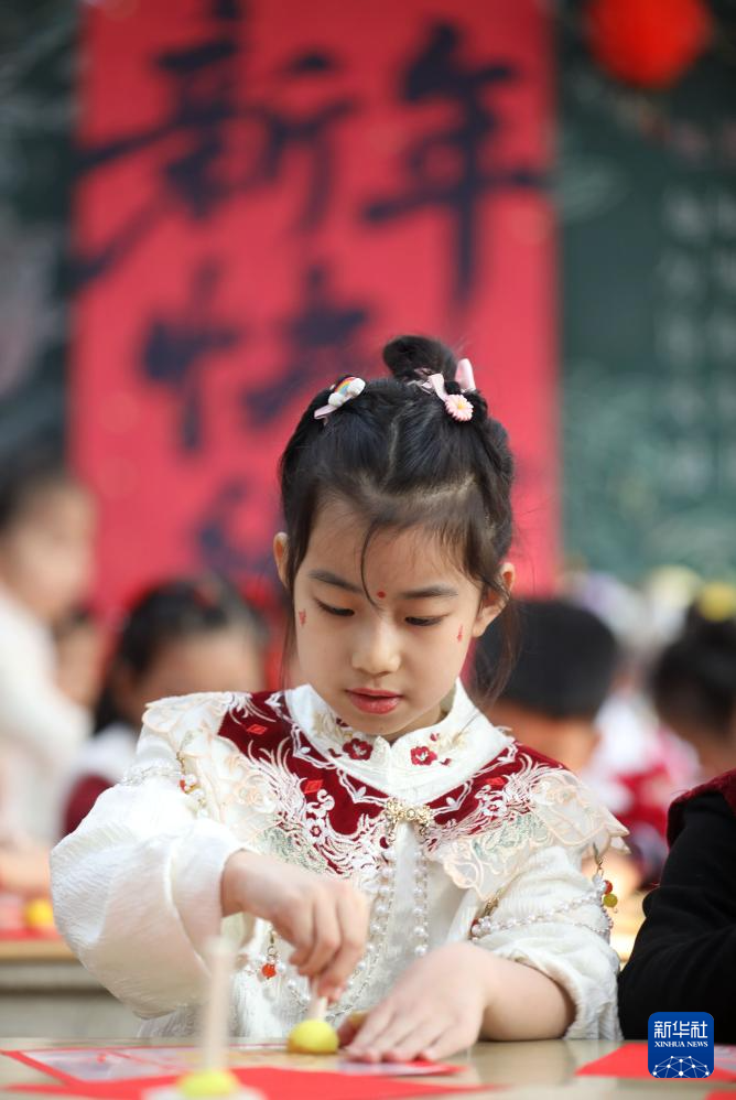 1月23日,在河北省石家庄市第三幼儿园举办的“多彩民俗迎腊八”主题活动中,小朋友体验传统民俗。新华社发(张晓峰 摄)
