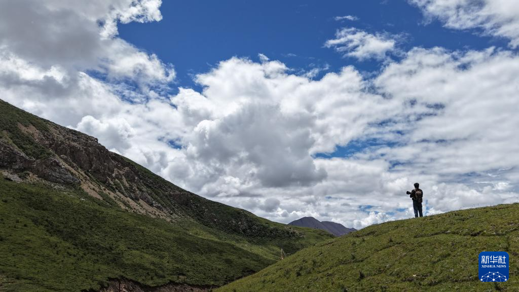 在青海省玉树藏族自治州杂多县昂赛乡,次丁在巡护中拍照(2025年8月9日摄,无人机照片)。 新华社记者 齐芷玥 摄