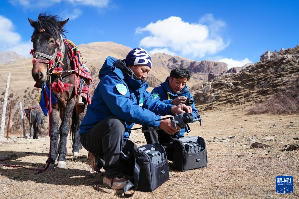 1月29日,次丁(左)和更尕在青海省玉树藏族自治州杂多县昂赛乡巡护中准备使用无人机。新华社记者 齐芷玥 摄