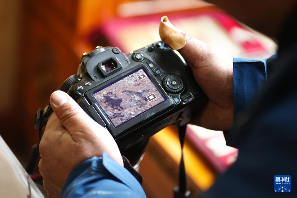 1月29日,次丁在青海省玉树藏族自治州杂多县昂赛乡的家中查看之前拍下的雪豹照片。新华社记者 齐芷玥 摄
