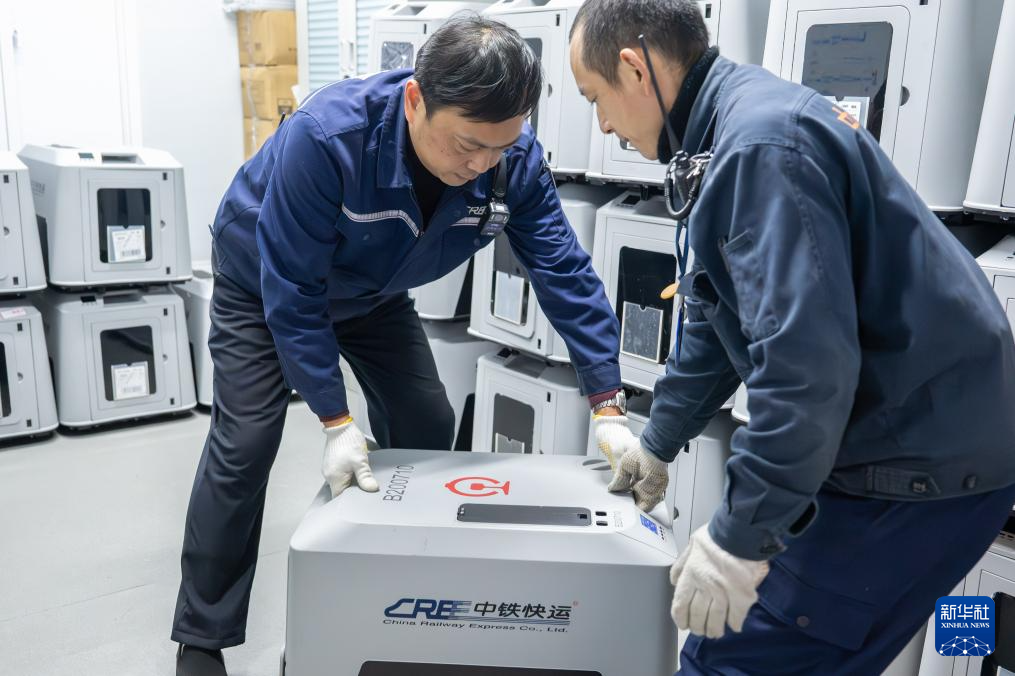 2月3日,在湖北武汉火车站,工作人员将“高铁宠物运输智能箱”搬到置换间等待宠物主人。新华社记者 杜子璇 摄