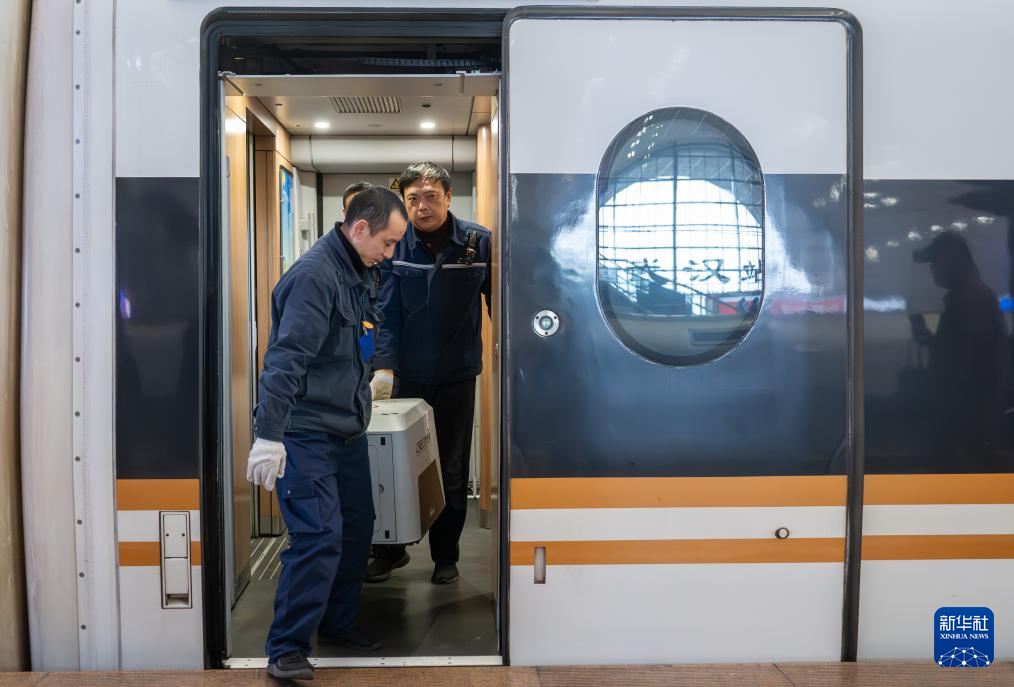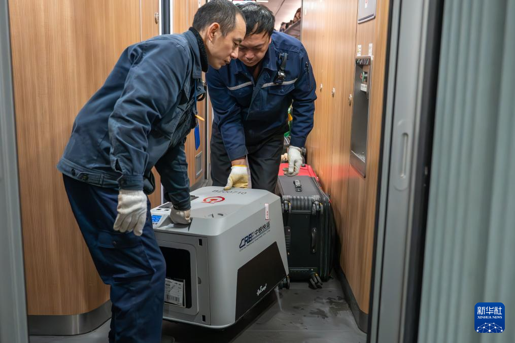 2月3日,在湖北武汉火车站,工作人员将“高铁宠物运输智能箱”搬下列车。新华社记者 杜子璇 摄