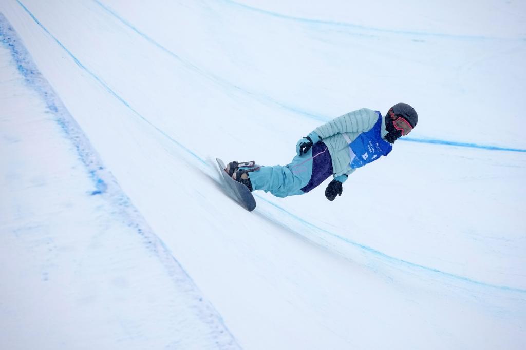 2025年12月12日,中国选手蔡雪桐在比赛中。当日,单板滑雪U型场地技巧世界杯女子组决赛在河北省张家口市崇礼区举行。新华社记者 王鹏 摄