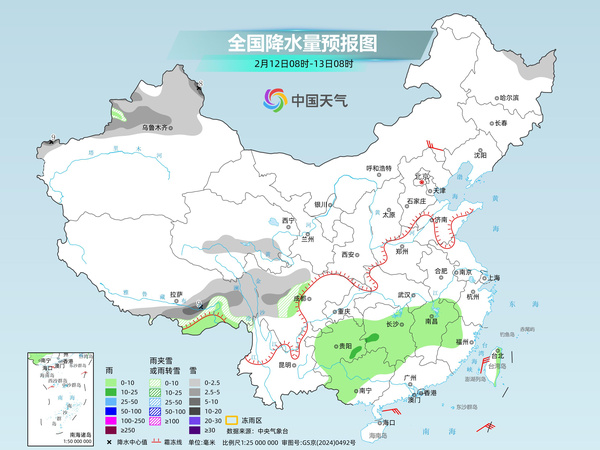 后天,内蒙古东部、黑龙江北部、新疆沿天山地区和南疆西部山区、西藏东南部、川西高原等地部分地区有小雪或雨夹雪,其中,内蒙古东北部、新疆伊犁河谷和南疆西部山区、西藏东部、川西高原南部等地部分地区有中到大雪。贵州、湖南、湖北南部、江西北部、安徽南部、浙江北部、广西西部和北部、台湾岛等地部分地区有小到中雨,其中,湖南中部、贵州东北部等地部分地区有大雨。