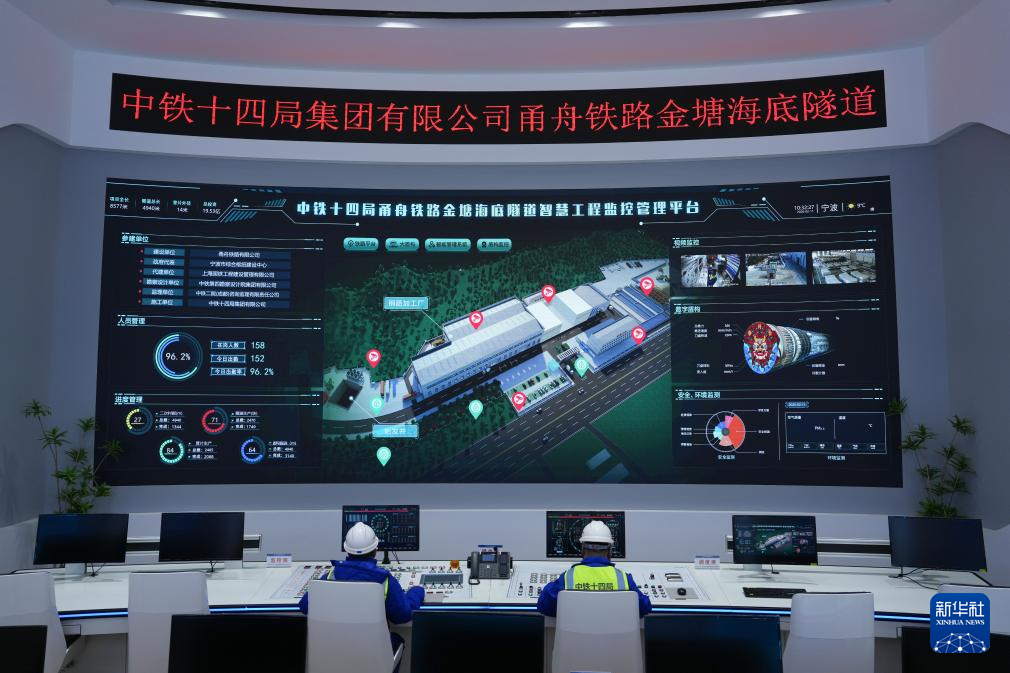 2月11日,中铁十四局技术人员通过甬舟铁路金塘海底隧道智慧工程监控管理平台进行远程施工管理。新华社记者 黄宗治 摄