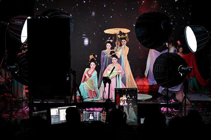 陕西省歌舞剧院的舞蹈演员在直播间进行“团播”表演(2025年12月25日摄)。