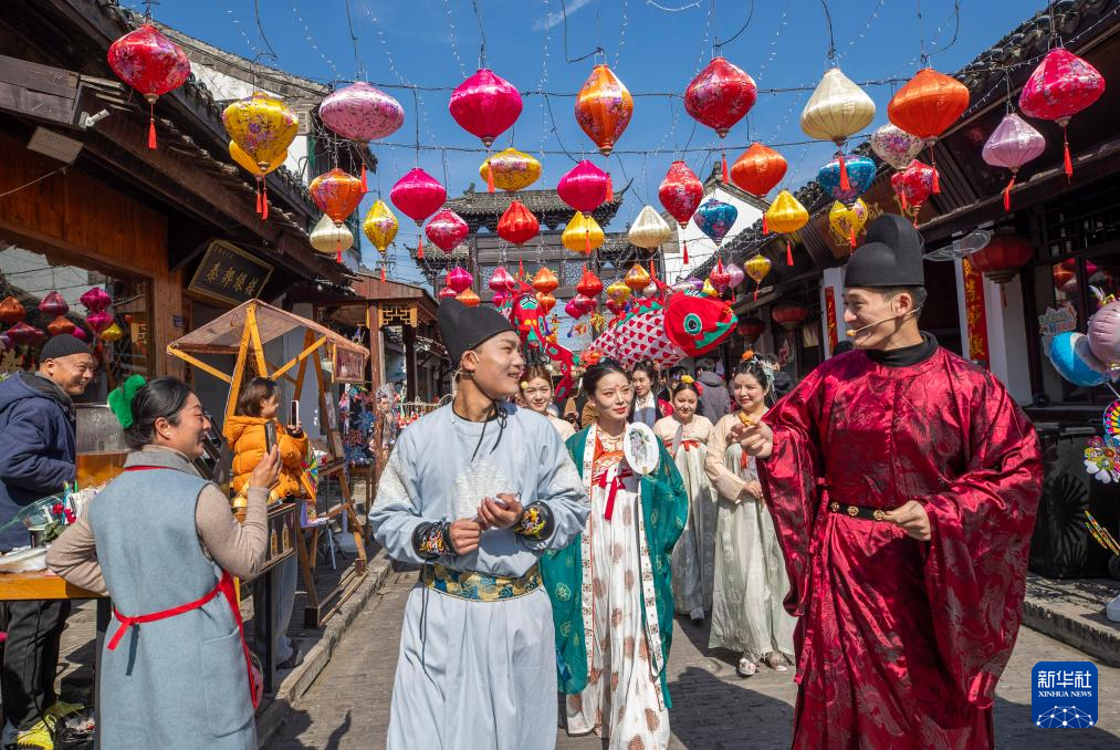 2月17日,在江苏省高邮市盂城驿景区,演员参加古风巡游。新华社发(周社根摄)