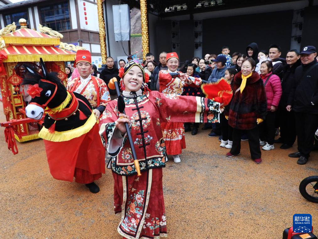 2月17日,在四川省达州市达川区三里坪街道,市民和游客观看民间艺人表演《车车灯》秧歌。新华社发(邓良奎摄)