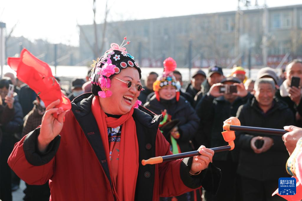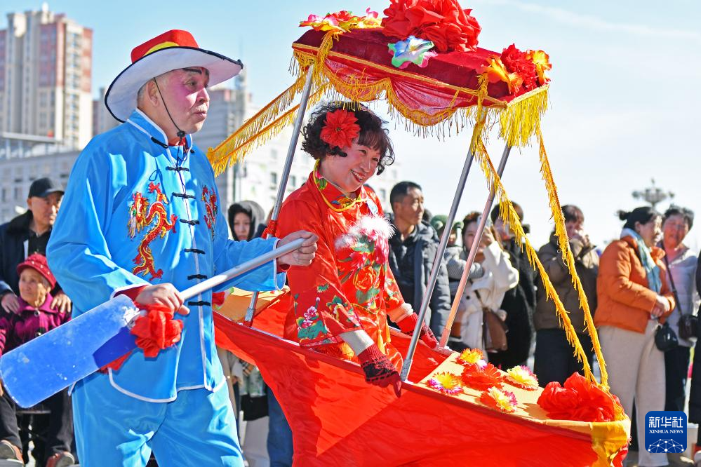 2月17日,在山东省荣成市市民文化活动公园,民间艺人进行渔家秧歌、渔家大鼓等民俗表演。新华社发(李信君摄)