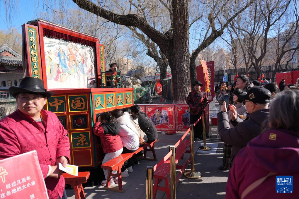 2月17日,市民和游客在北京龙潭庙会上观看“拉洋片”。新华社记者 谢晗 摄