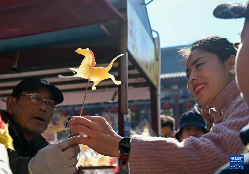 2月17日,在天津古文化街,糖画艺人张福泉(左)将马造型的糖人递给顾客。新华社记者 孙凡越 摄