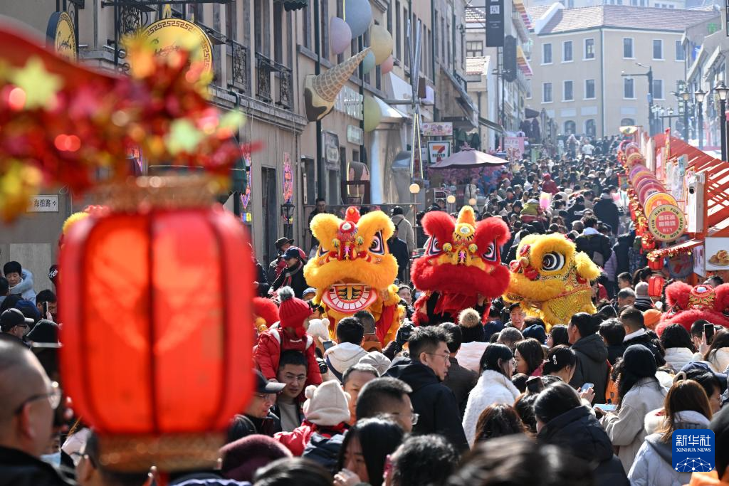 2月17日,游客在山东省青岛市市北区大鲍岛文化休闲街区观看舞狮表演。新华社记者 李紫恒 摄