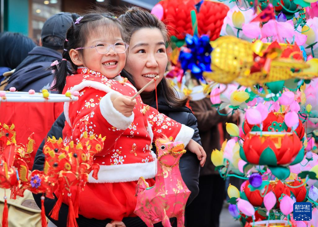 2月17日,家长和小朋友在南京夫子庙花灯市场挑选花灯。新华社发(苏阳摄)
