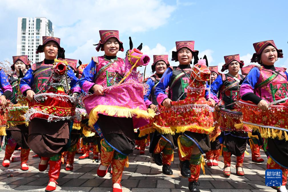 2月17日,当地群众在云南省文山壮族苗族自治州文山市步行街表演壮族纸马舞。新华社发(熊平祥摄)