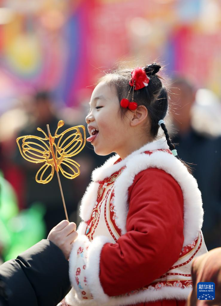 2月17日,在山东省临沂市郯城县郯国古城景区,一名小女孩在品尝糖画。新华社发(张春雷摄)