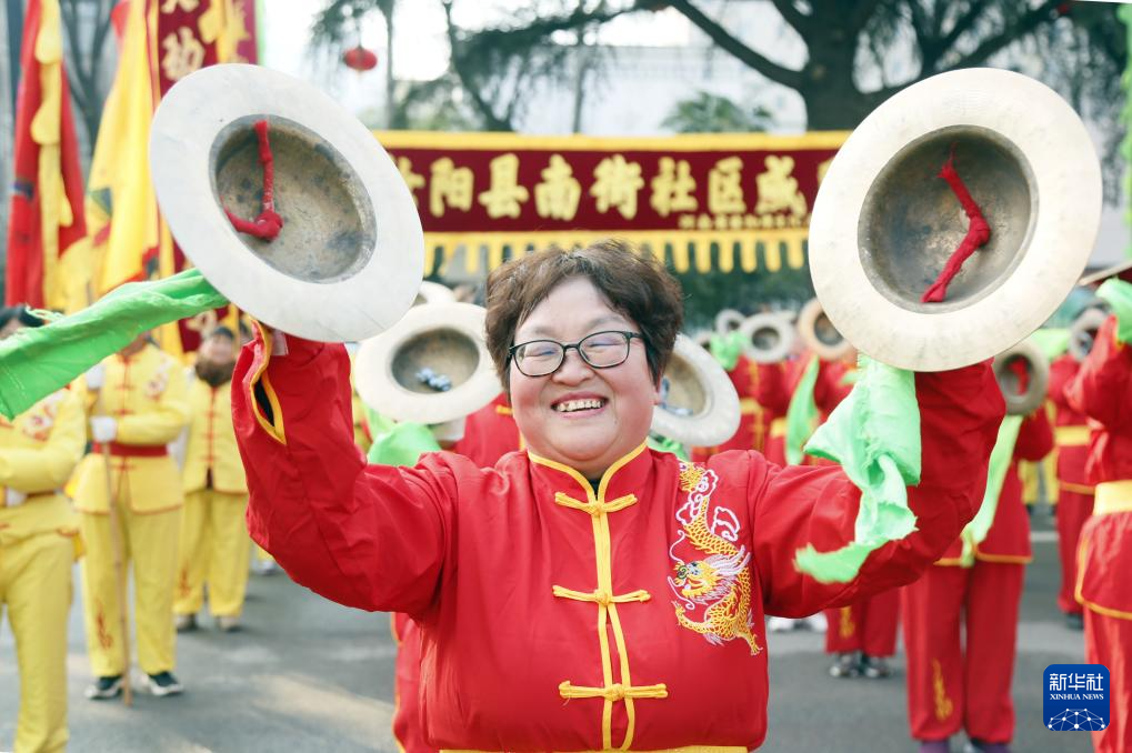 2月17日,河南省洛阳市汝阳县城关镇南街社区威风锣鼓队队员表演打镲。新华社发(康红军摄)