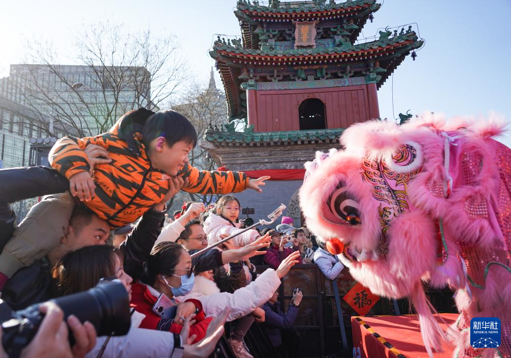 2月17日,游客在北京市朝阳区东岳庙庙会上摸狮头。新华社记者 陈钟昊 摄