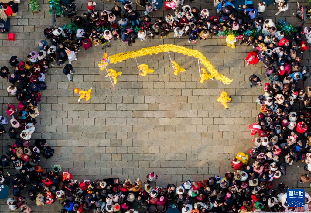 2月17日,人们在江苏省泰州市海陵区老街景区观看舞龙表演(无人机照片)。新华社发(杨玉岗 摄)