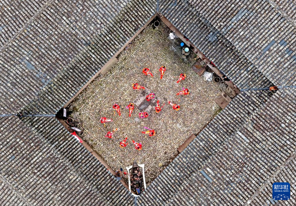 2月17日,在浙江省台州市仙居县埠头镇西亚村,民间艺人表演“跳跳马”(无人机照片)。新华社发(王华斌 摄)