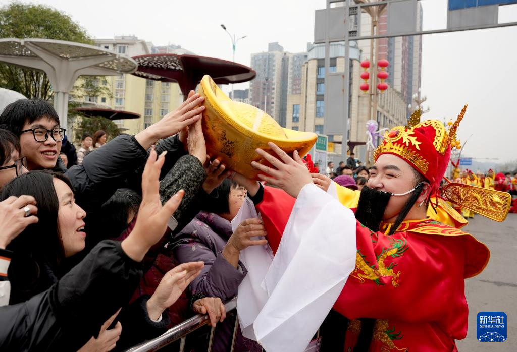 2月17日,在四川省华蓥市举行的群众文化巡游活动上,巡游演员与市民互动。新华社发(周松林 摄)