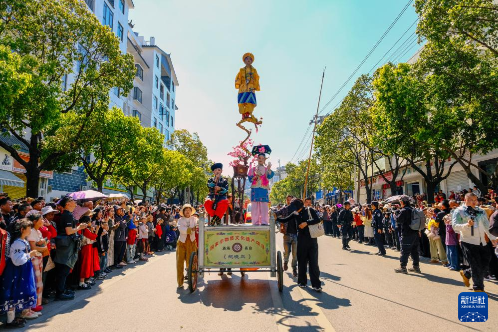 2月17日,游客在云南省玉溪市通海县观看传统民俗通海高台展演。新华社发(张洪科摄)