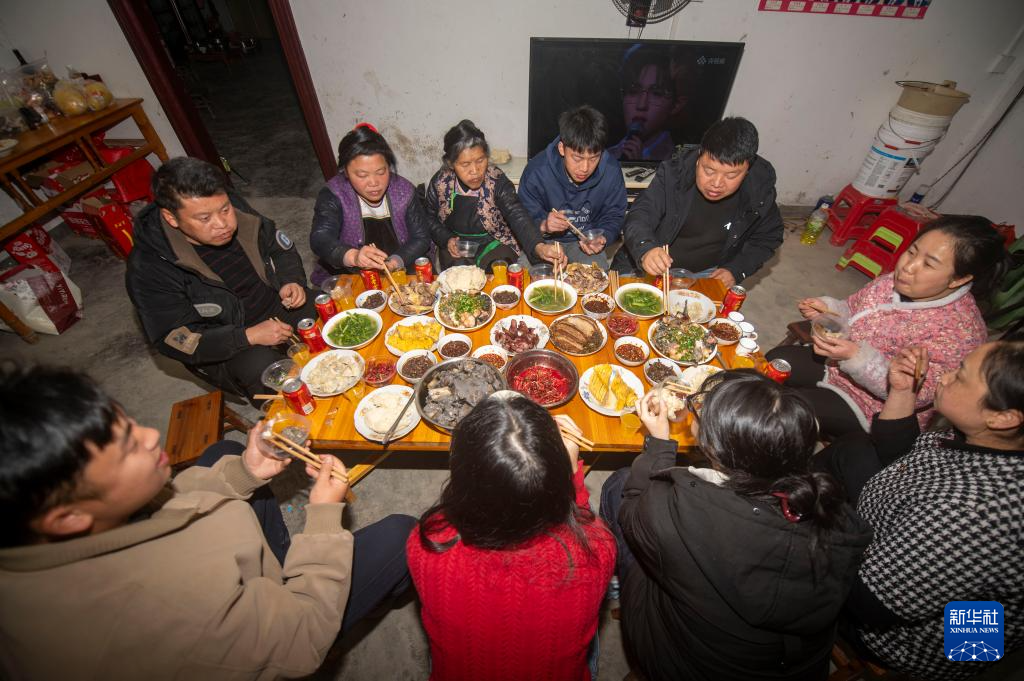 2月16日,贵州省黔东南苗族侗族自治州从江县丙妹镇大塘村一户居民吃年夜饭。新华社发(吴德军摄)