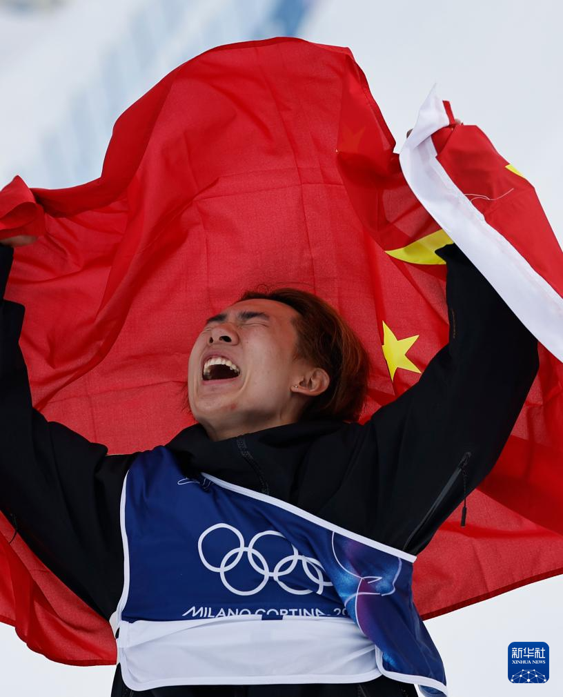 2月18日,中国选手苏翊鸣在比赛后庆祝夺冠。新华社记者 王鹏 摄