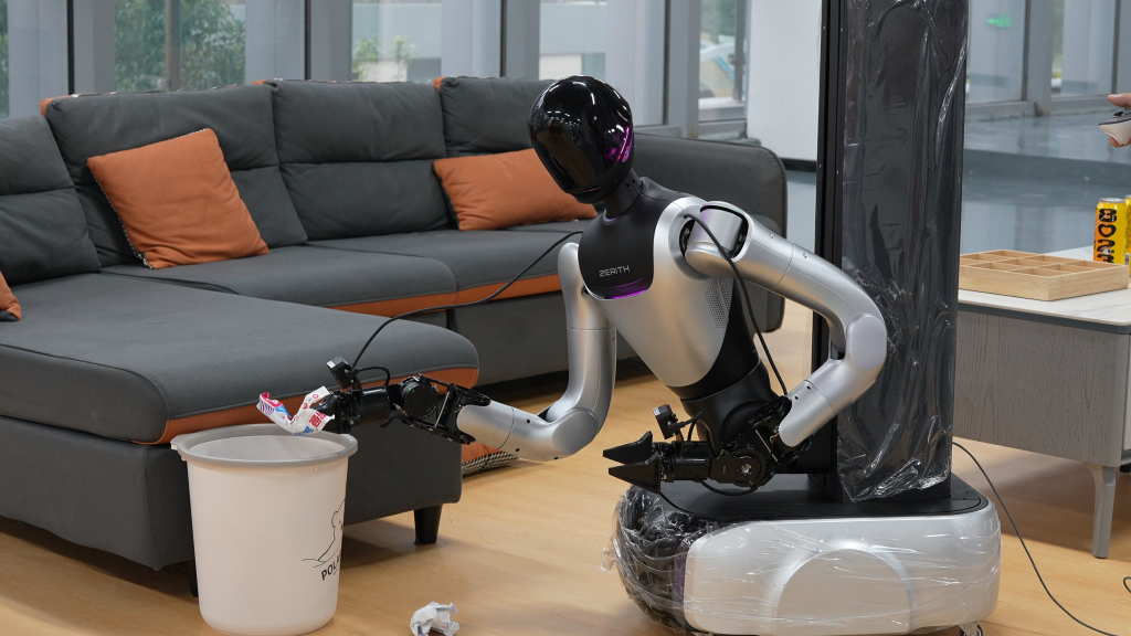 随着人工智能和具身智能技术的加速演进,更具前瞻性的“AI+服务”探索正在开展。在合肥零次方机器人有限公司,研发人员在公共卫生间复刻场景中,训练一款轮臂人形机器人完成擦桌子、清洁马桶、叠衣服、使用吸尘器打扫卫生等任务。