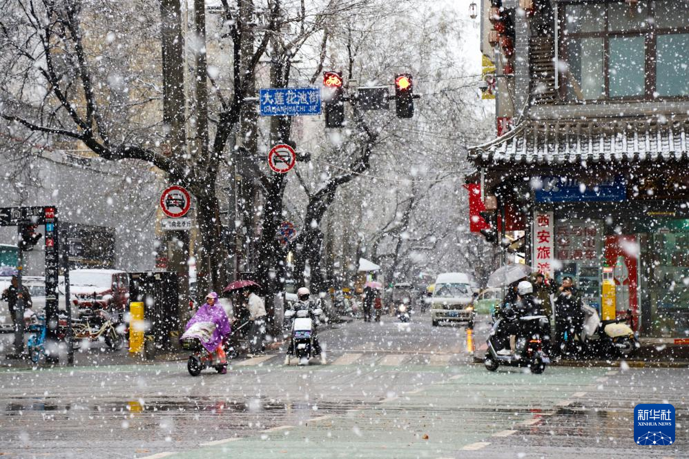 2月23日,在陕西省西安市街头,市民冒雪出行。新华社发(薛刚摄)