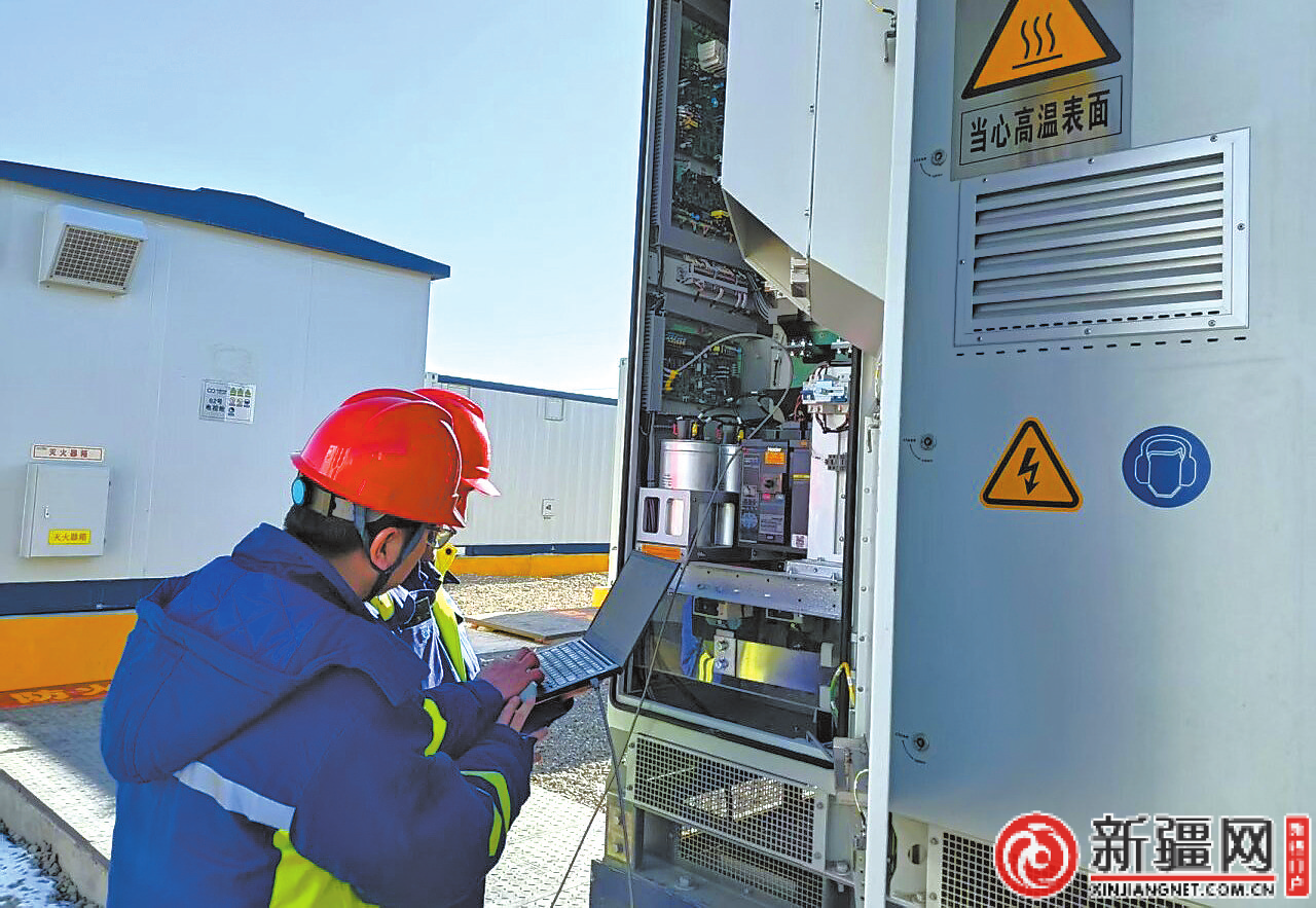中节能达坂城100MW/400MWh独立储能项目现场,工作人员进行设备调试。(记者史传芝 通讯员袁航摄)