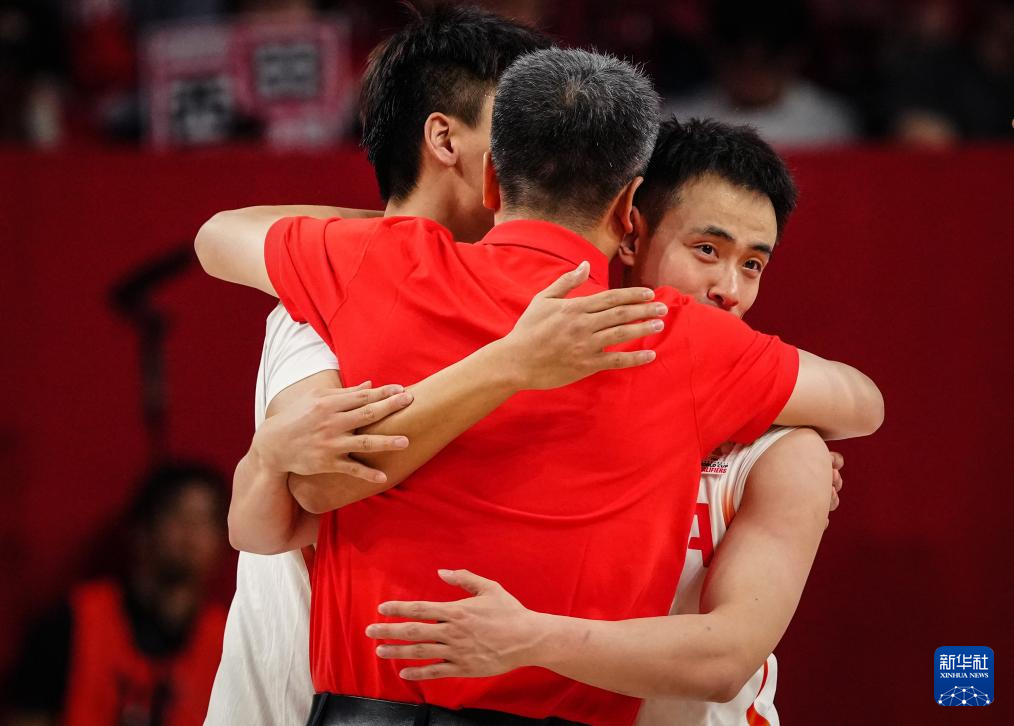 2月26日,中国队球员赵继伟(右)在比赛后与主教练郭士强庆祝胜利。新华社记者 贾浩成 摄