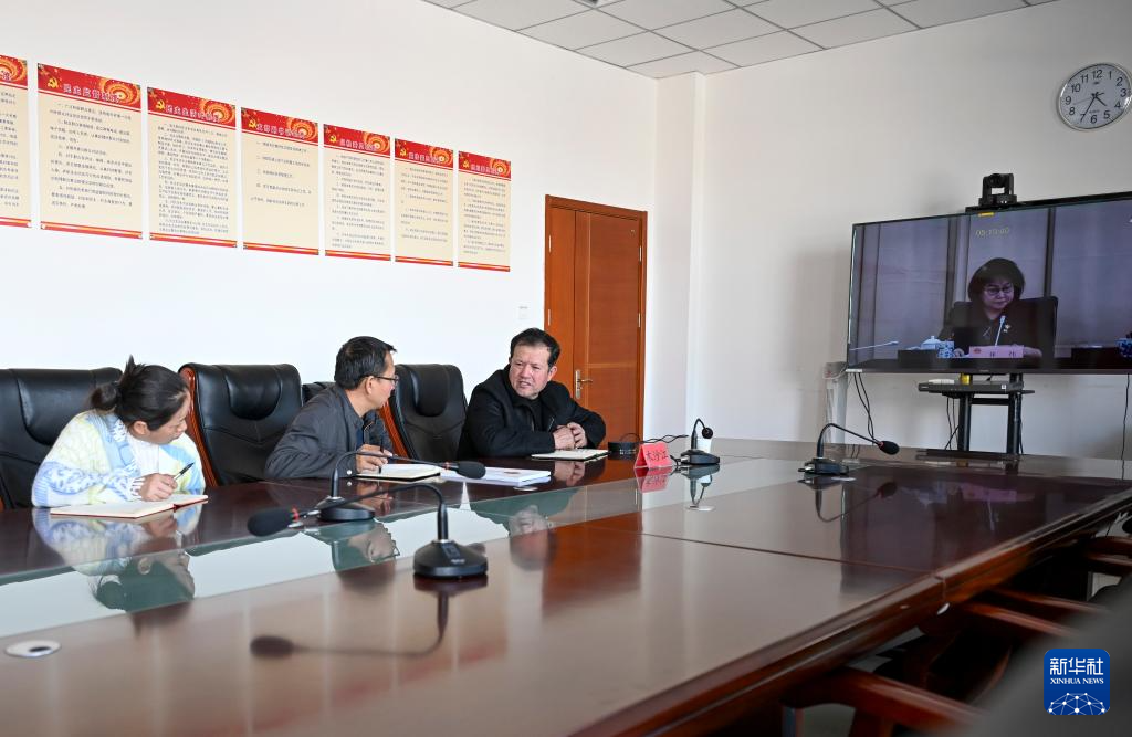 2月9日,在伊犁哈萨克自治州新源县,木沙江·海拉特(右)参加自治区组织的人大代表行前视频会议。