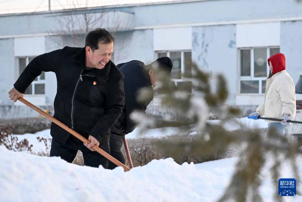 2月9日,在伊犁哈萨克自治州新源县,木沙江·海拉特(前)在克热格塔斯村党群服务中心和当地干部一起清理积雪。