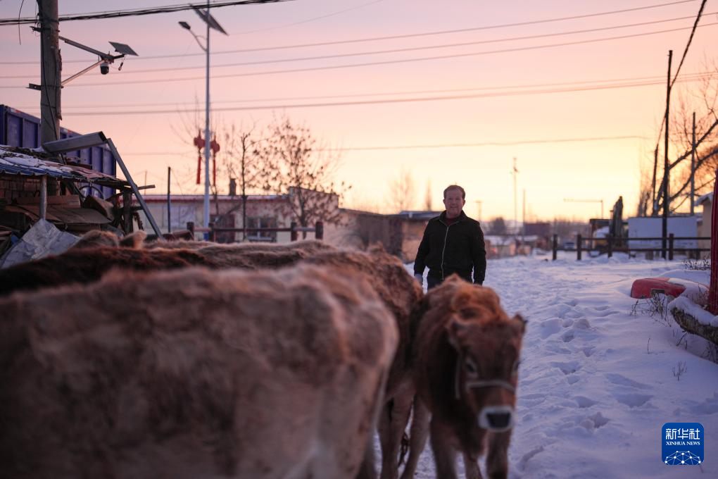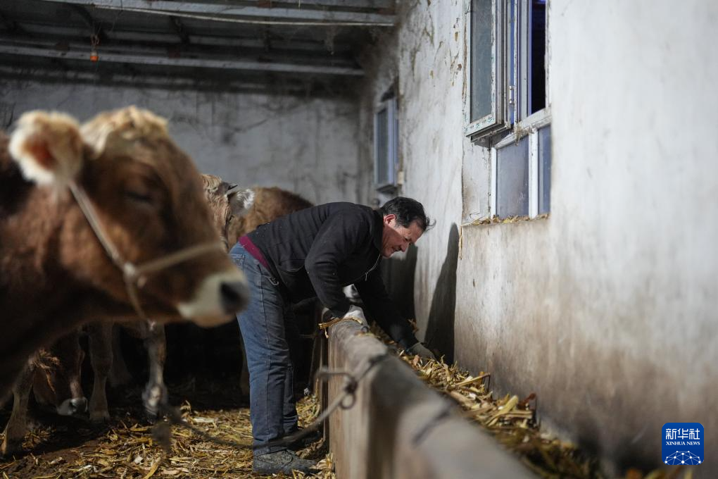 2月9日,在伊犁哈萨克自治州新源县,早起的木沙江·海拉特在自家的牛棚里喂牛。