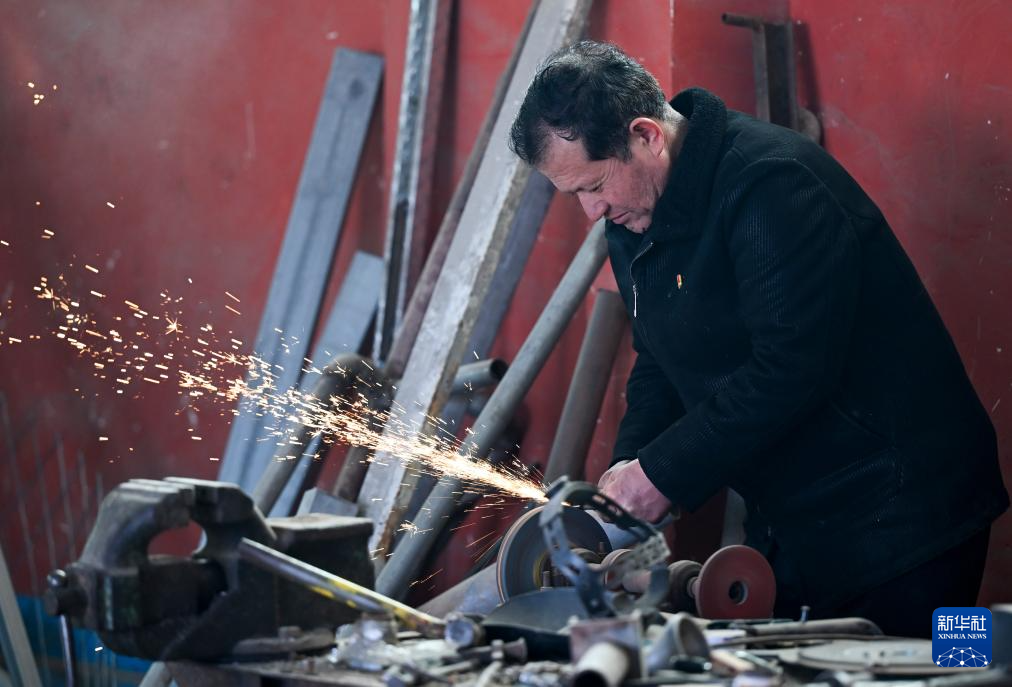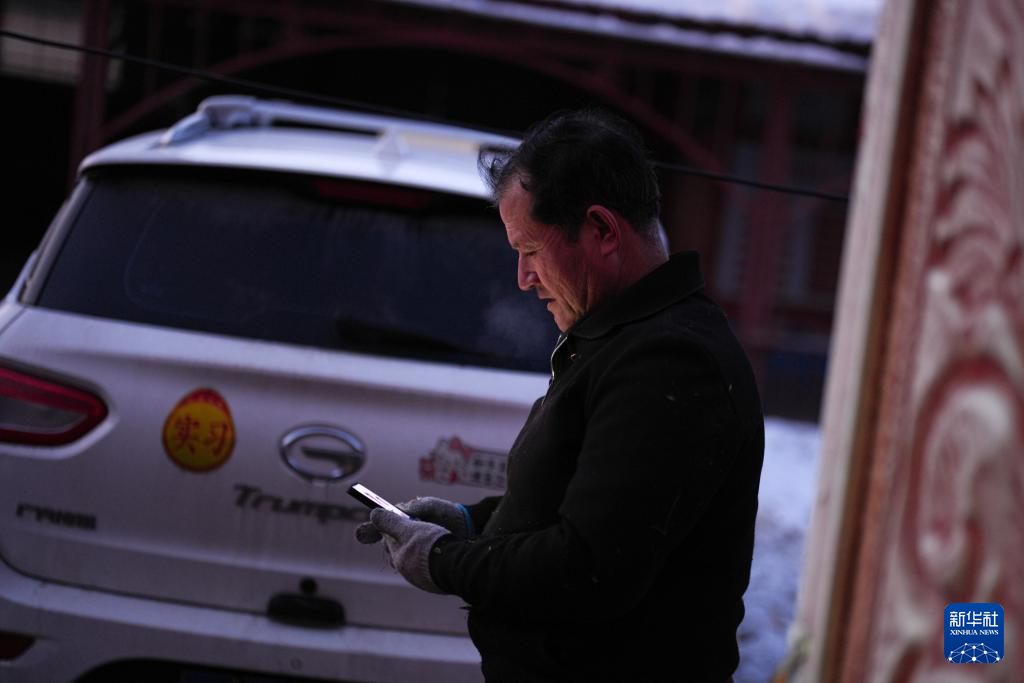 2月9日,在伊犁哈萨克自治州新源县,木沙江·海拉特在自家的院子里查看乡亲发来的电焊需求。