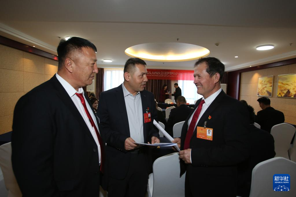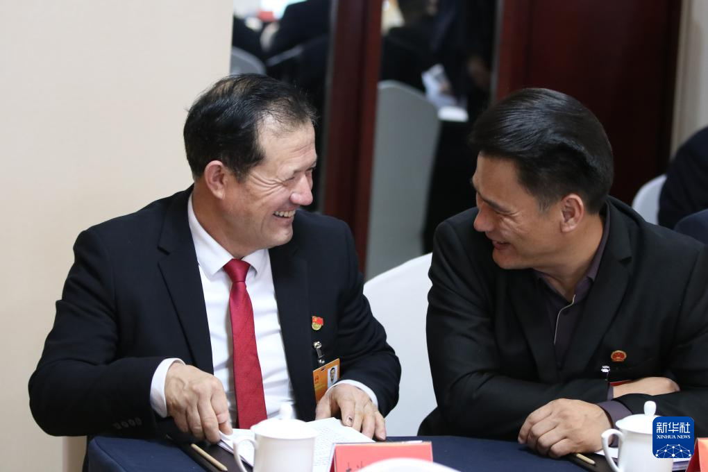 1月31日,木沙江·海拉特(右)以列席代表身份参加新疆维吾尔自治区第十四届人民代表大会第四次会议。会议间隙,木沙江和其他代表交流。