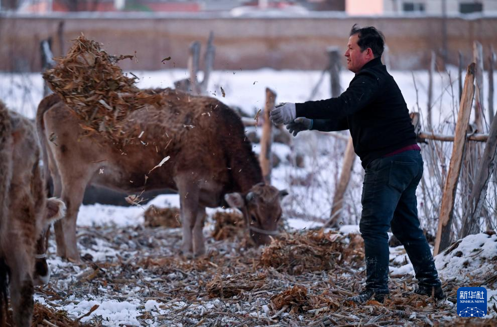 2月9日,在伊犁哈萨克自治州新源县,木沙江·海拉特给牛加草料。