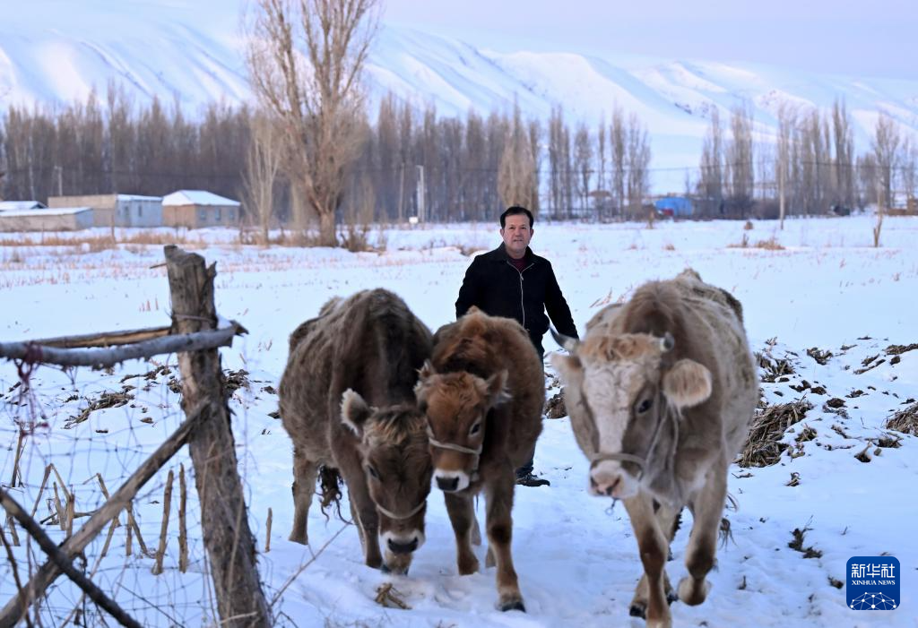 2月9日,在伊犁哈萨克自治州新源县,木沙江·海拉特在放牛。
