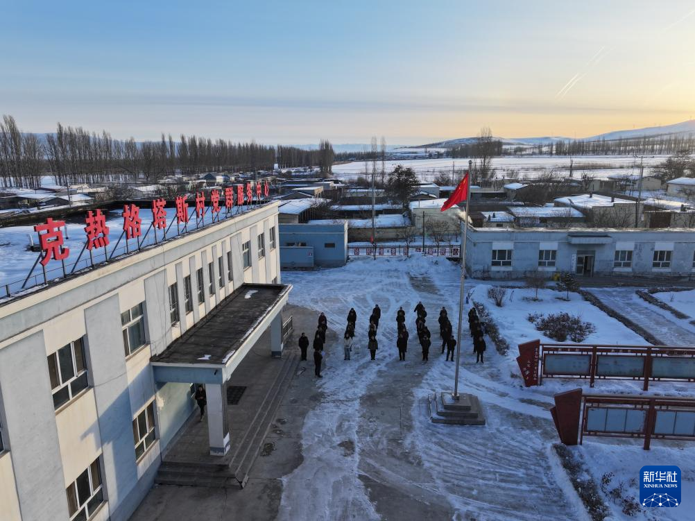 2月9日,在伊犁哈萨克自治州新源县,木沙江·海拉特在克热格塔斯村党群服务中心参加升国旗仪式(无人机照片)。