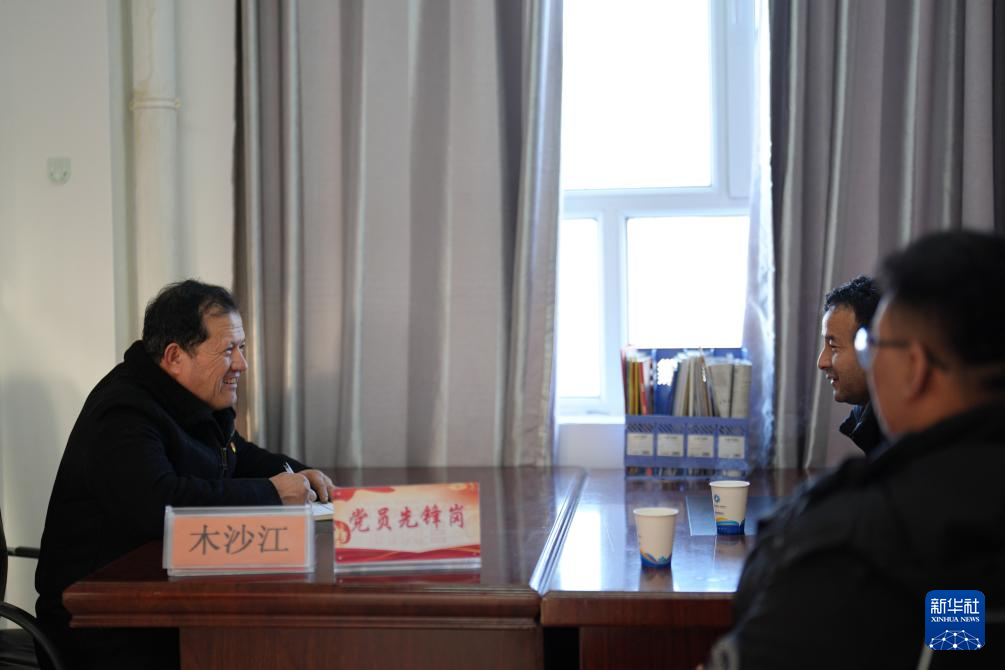 2月9日,在伊犁哈萨克自治州新源县,木沙江·海拉特(左)在克热格塔斯村党群服务中心接待来访群众。